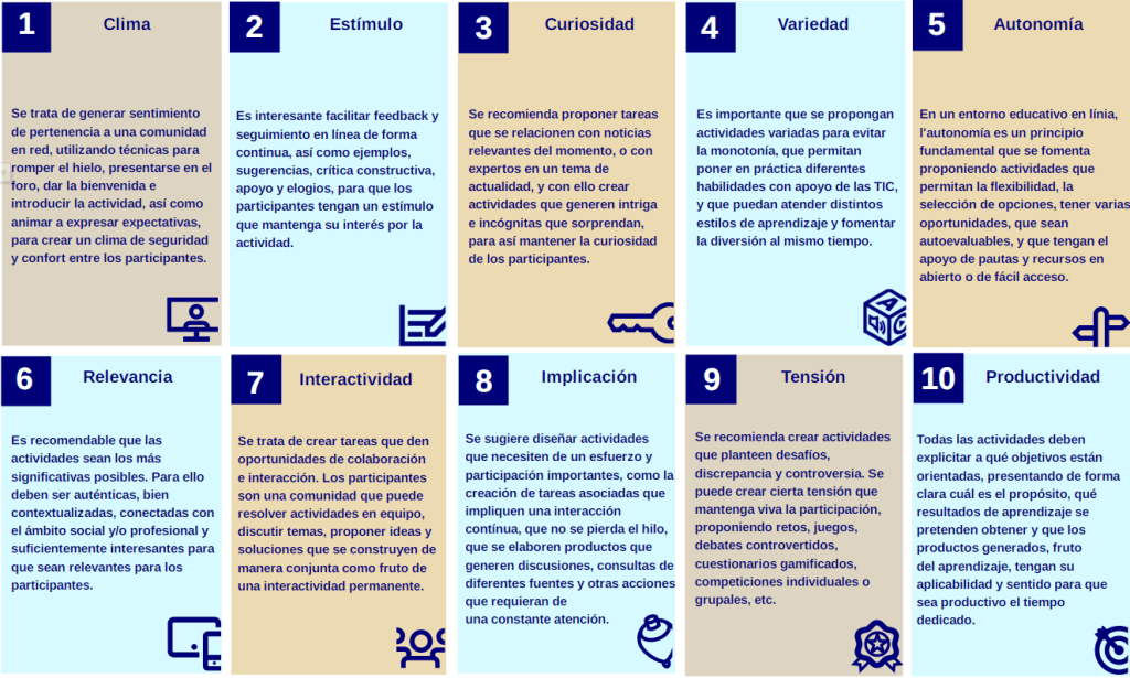Como ejemplo les dejo un cuadro de distintas actividades organizadas en diez principios motivadores del aprendizaje: