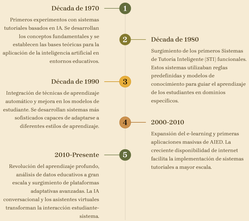 La investigación en Inteligencia Artificial en la Educación (AIED) tiene una trayectoria extensa y rica que se remonta a la década de los 70. Desde sus inicios, estos sistemas emergieron con una promesa revolucionaria: los tutores inteligentes tendrían el potencial de transformar radicalmente la educación gracias a su capacidad de personalización, como señaló Woolf en 20071.