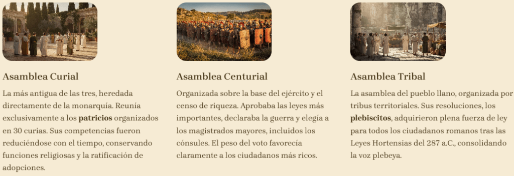 La República Romana articuló la participación ciudadana a través de tres grandes asambleas, cada una con su propia composición, competencias y peso político.