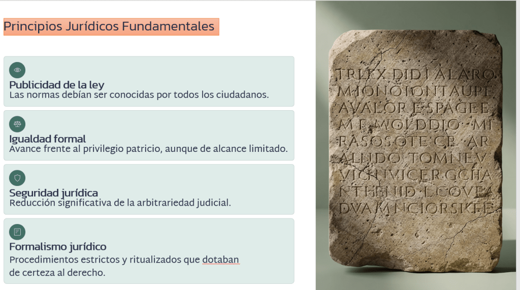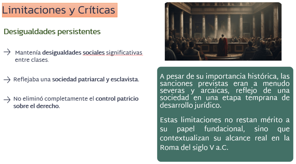 En resumen, podemos ver que la Ley de las XII Tablas representa un punto de inflexión en la historia del derecho. No solo consolidó un sistema normativo accesible y relativamente uniforme, sino que también simbolizó la lucha por la justicia y la equidad en una sociedad profundamente estratificada.